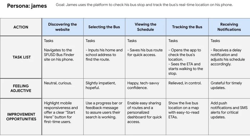 James is a tech-savvy high school freshman.who needs an easy-to-use, responsive platform to track his bus in real-time because he wants to manage his schedule independently without unnecessary delays or confusion.