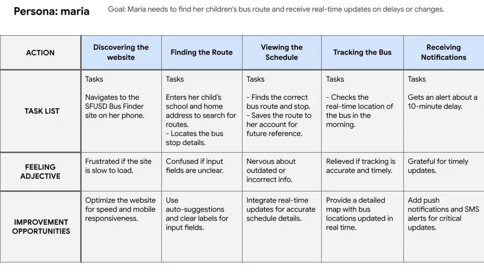 Maria is a working mom juggling her job and her children's school schedules.who needs a simple and mobile-friendly way to find accurate bus route and stop information because she struggles with outdated schedules and overly complicated tools that waste her time.
